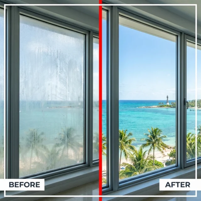 During our years serving properties from Stock Island to Key Largo, we’ve documented how untreated salt deposits can reduce glass clarity by up to 40% within just two years. That’s not just an aesthetic problem: it’s a home value disaster waiting to happen.