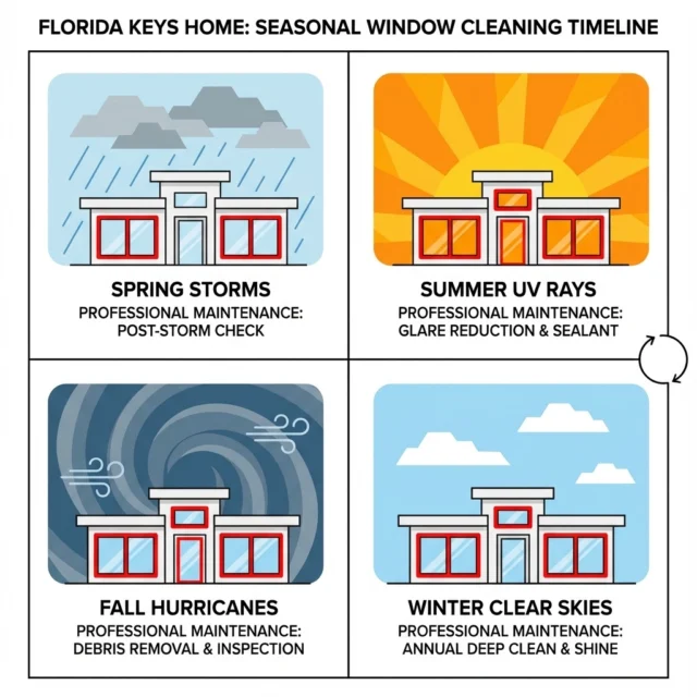 Window washing home Florida Keys requires understanding seasonal patterns that don’t exist in other climates. Spring brings increased pollen and storm preparation needs. Summer intensifies UV damage and requires more frequent attention to south-facing windows. Fall hurricane season means post-storm cleanup and assessment. Winter brings snow bird traffic and increased road dust.